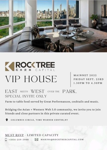 在这个具有纪念意义的时刻,9月23日,RockTree Capital 在曼哈顿中心地标性建筑-Time Warner Center举办了一场由 Web 3.0 行业领导者组成的 VIP 聚会,出席嘉宾包括Fenbsuhi、Hashed、Shima Capital、SNZ、红杉、火币和 Galaxy、Republic、Bixin、Collider、Coral Capital、JP Morgan、Monday Capital、TRGC、Protagonist、100 Acre Ventures、DAO5、Ropart、Stratified Capital、Mechanism Capital等等。