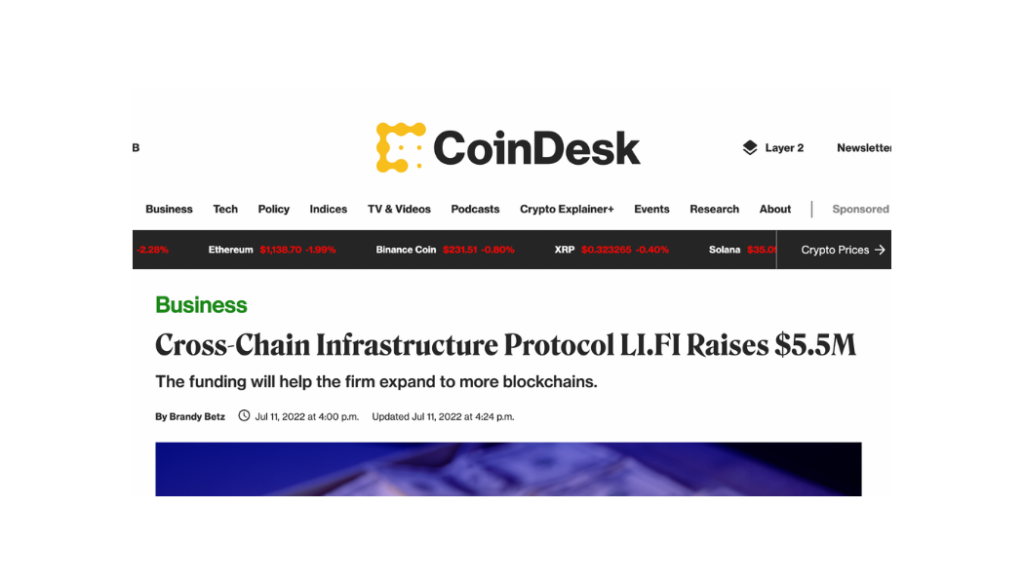 LI.FI是一个汇集跨链桥梁和去中心化交易所 (DEXs) 的基础设施协议,在新一轮融资中筹集550万美元,由加密投资公司1kx领投。LI.FI 创始人兼首席执行官Philipp Zentner在接受CoinDesk采访时表示,新资金将用于支付营销费用以及帮助LI.FI扩展到更多的区块链。