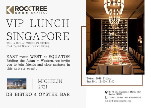 9月30日中午,世界知名投资公司RockTree Capital 携手FBG、Waterdrip Capital、Bixin Ventures、ArkStream Capital、Woodstock Fund、Hack.vc、Cipholio Ventures、GoldenGate Chain等投资机构,在Token2049期间齐聚新加坡金沙酒店(MBS)的米其林星餐厅DB BISTRO & OYSTER BAR,邂逅顶级米其林大厨深秋定制专属RockTree嘉宾的私家盛宴,共同论道行业发展!
