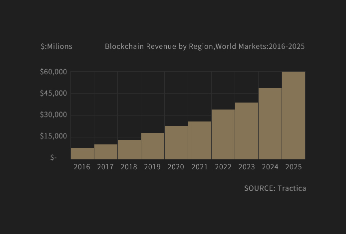 应用区块链技术的全球企业年度收入将从2016年约250亿美元增至2050年的6070亿美元,呈现复合年增长率为26%。